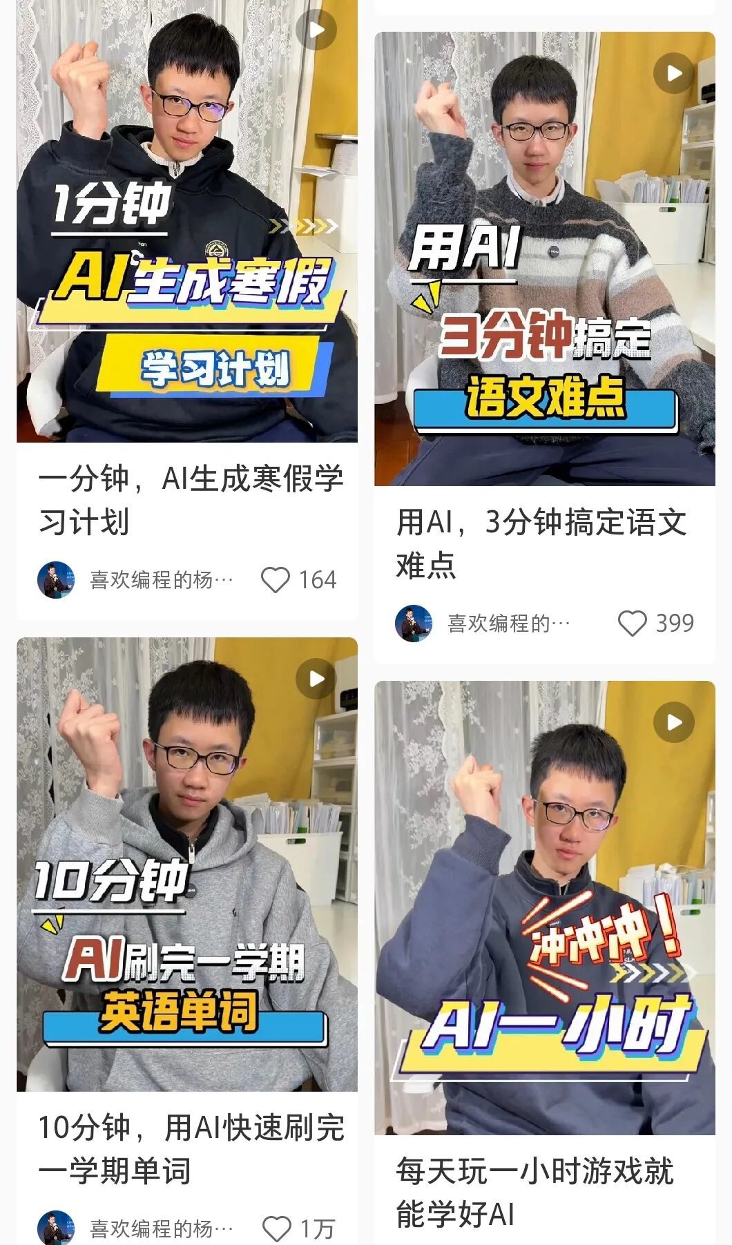 这种特质在13岁的初中生杨曦哲身上体现得淋漓尽致。除了是一名能跑通信奥赛难题的极客,他的另一个身份是拥有11万粉丝的小红书AI博主。他自己用AI辅助学习,也把自己的种种AI用法做成视频教程,在全网有超过2000万的播放量。这种博主的身份,塑造了他的产品观。他在评论区里看到了无数同龄人的困惑、家长的焦虑,这些真实的互动影响着他的研发方向。
