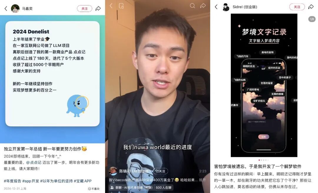 譬如大学毕业就创业、24岁的独立开发者马嘉奕,在从专注苹果生态转向AI领域的过程中,将小红书当成了自己的“透明工作室”。编程教程、从无到有的每一点开发进度,乃至失败的经验,他全都摊在用户面前。评论区既是他与网友们之间的互动渠道,也是共创现场。