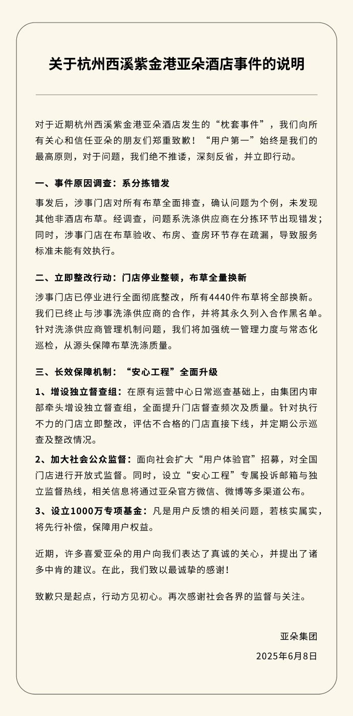 亚朵集团表示,对于近期杭州西溪紫金港亚朵酒店发生的“枕套事件”,向所有关心和信任亚朵的朋友们郑重致歉。事发后,涉事门店对所有布草全面排查,确认问题为个例,未发现其他非酒店布草。经调查,问题系洗涤供应商在分拣环节出现错发同时,涉事门店在布草验收、布房、查房环节存在疏漏,导致服务标准未能有效执行。